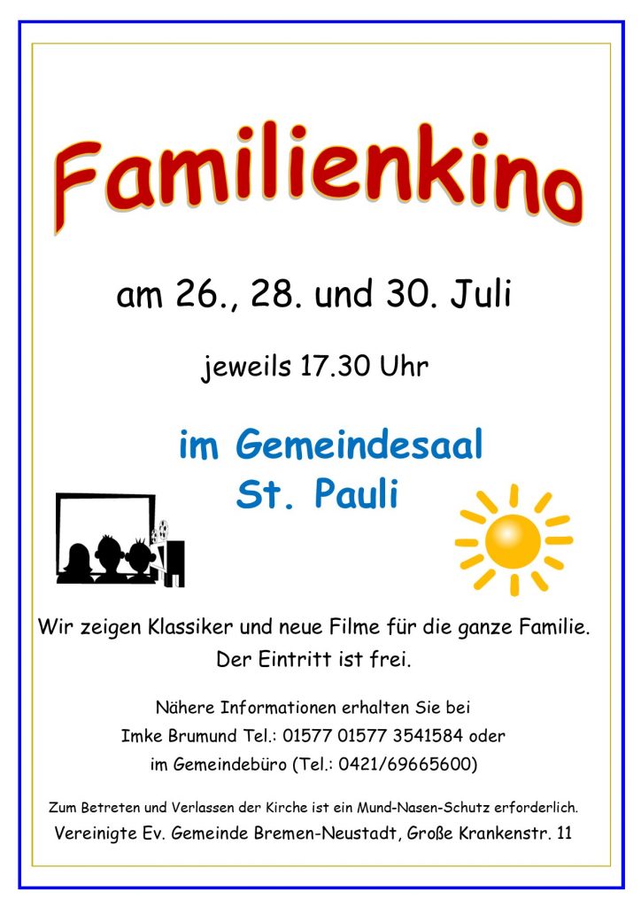 Ihr habt Lust auf einen geselligen Kinoabend? Dann seid ihr bei uns an der richtigen Stelle, denn am 26., 28. und am 30. Juli zeigen wir im Gemeindesaal St. Pauli Familienfilme. Wir starten um 17:30 Uhr. Es stehen euch jedes Mal drei Filme zur Auswahl, von denen der Favorit abgespielt wird. Ihr braucht euch nicht um Snacks zu kümmern, da wir alles zum Selbstkostenpreis anbieten. Natürlich achten wir auf die derzeit geltenden Corona Regelungen. Deshalb ist beim Betreten und Verlassen des Gemeindehauses ein Mund-Nasen-Schutz erforderlich.