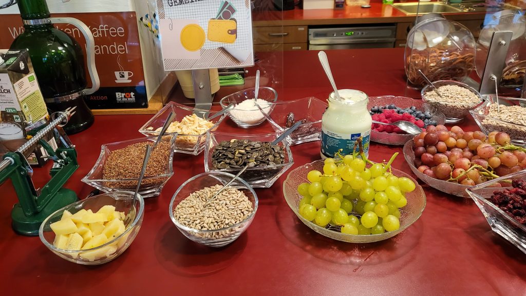 Mit der Flockenquetsche bereiten wir unsere Haferflocken vor, dazu gibt es frisches Obst, Nüsse und verschiedene Sorten von Milch wie z.B. Hafermilch oder Mandelmilch.