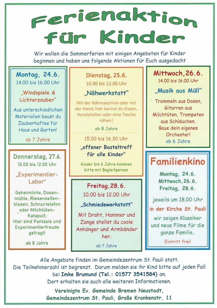Die Sommerferien stehen vor der Tür!Damit keine Langeweile aufkommt, könnt ihr gerne in der ersten Ferienwoche an diesen Aktionen teilnehmen!Wir freuen uns auf euch!Imke Brumund & Team FerienprogrammKinderSt. Pauli