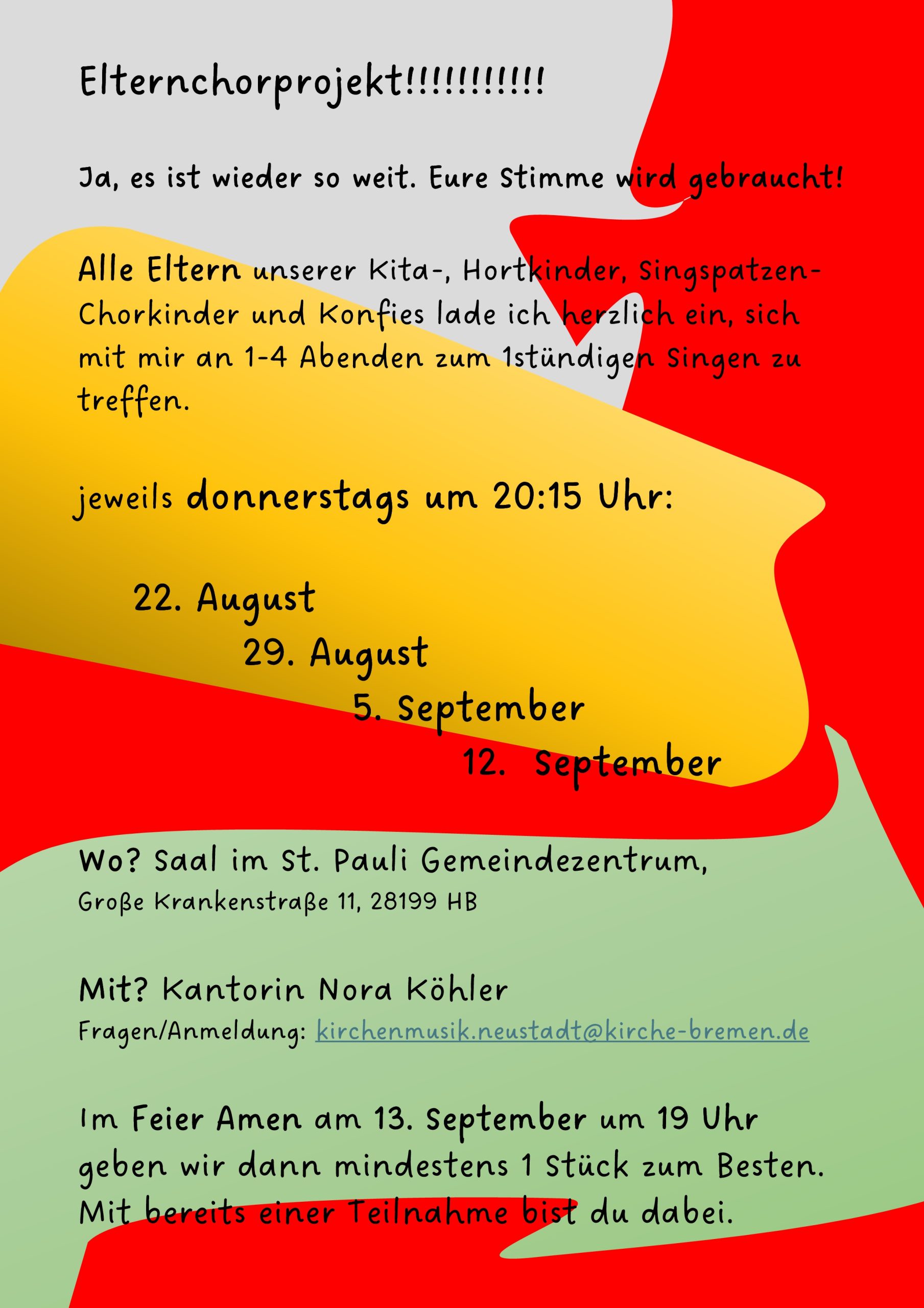 Ich bitte um vorherige Anmeldung. Um den Spaß und Sinn des gemeinsamen Singens zu garantieren, findet die Probe nur mit mindestens 8 Leuten statt. Hier könnt ihr euch eintragen. Elternchor | Aug, Sept 2024 ChorChorprobeChorprojektElternKirchenmusikMusikNora KöhlerSt. Pauli