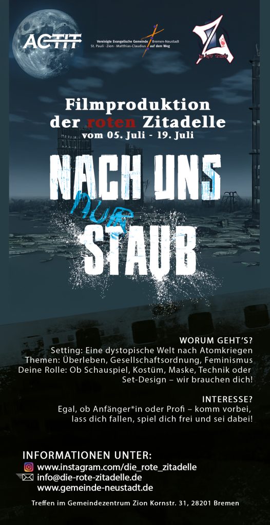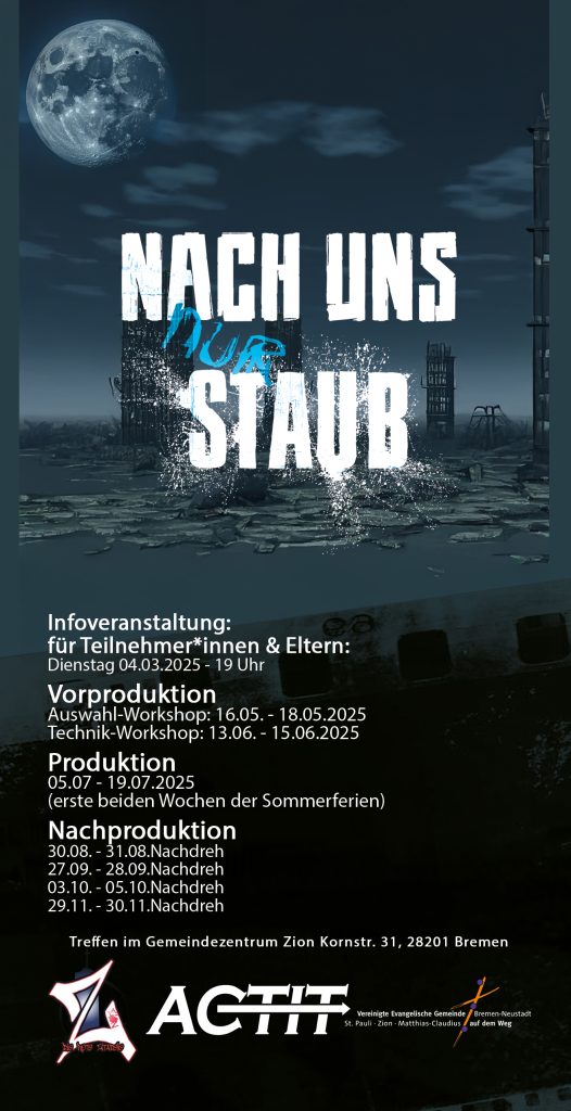 Stell dir vor, du wächst in einer Welt auf, in der alles, was du kanntest, in Schutt und Asche liegt. Zerstörte Städte, verstrahlte Landschaften, ein täglicher Kampf ums Überleben – und dennoch keimt irgendwo die Hoffnung auf Neuanfang. Es gab Krieg, die komplette Gesellschaftsordnung ist zusammengebrochen, Extremisten sind an der Macht und du musst jeden Tag dein Überleben sichern – entweder schutzlos und alleine den Raidern ausgeliefert sein oder gemeinsam mit anderen Überlebenden die eigene Moral und Ethik jeden Tag neu definieren, um dein Überleben zu sichern. Wie entscheidest du dich? Genau hier setzt unser Filmprojekt „Nach uns nur Staub“ an.
