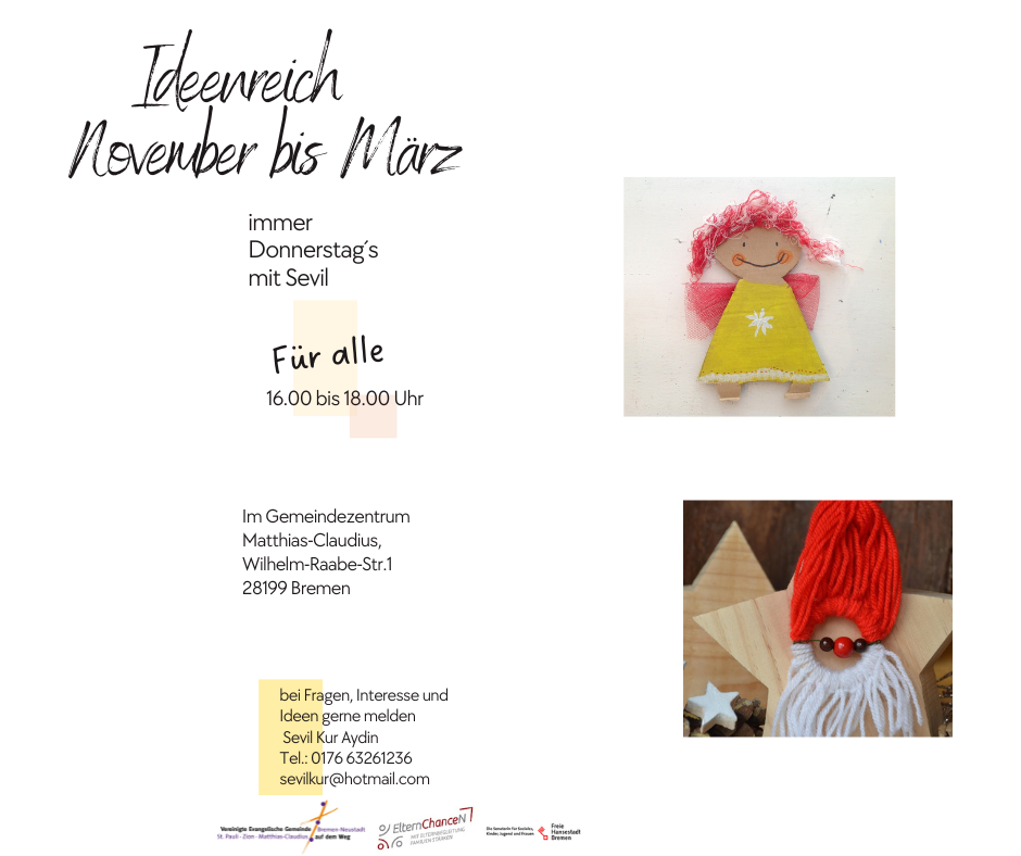 Donnerstags von 16 bis 18 Uhr öffnet unser kreatives Ideenreich im Gemeindezentrum Matthias-Claudius. Wir arbeiten mit Scheren, Pinseln, Stoffen u.v.m. Das Angebot ist für Kinder ab 3 Jahren und wird von Sevil Kur Aydin gestaltet. Herzlich willkommen! ElternchancenFamilien