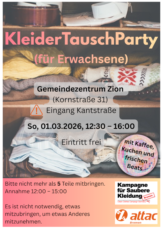 Zweimal im Jahr veranstalten wir im Theatersaal in Zion die Kleidertausch-Party. Kommt gerne vorbei, bringt Dinge mit oder schaut euch um und genießt die Atmosphäre. Herzlich willkommen!